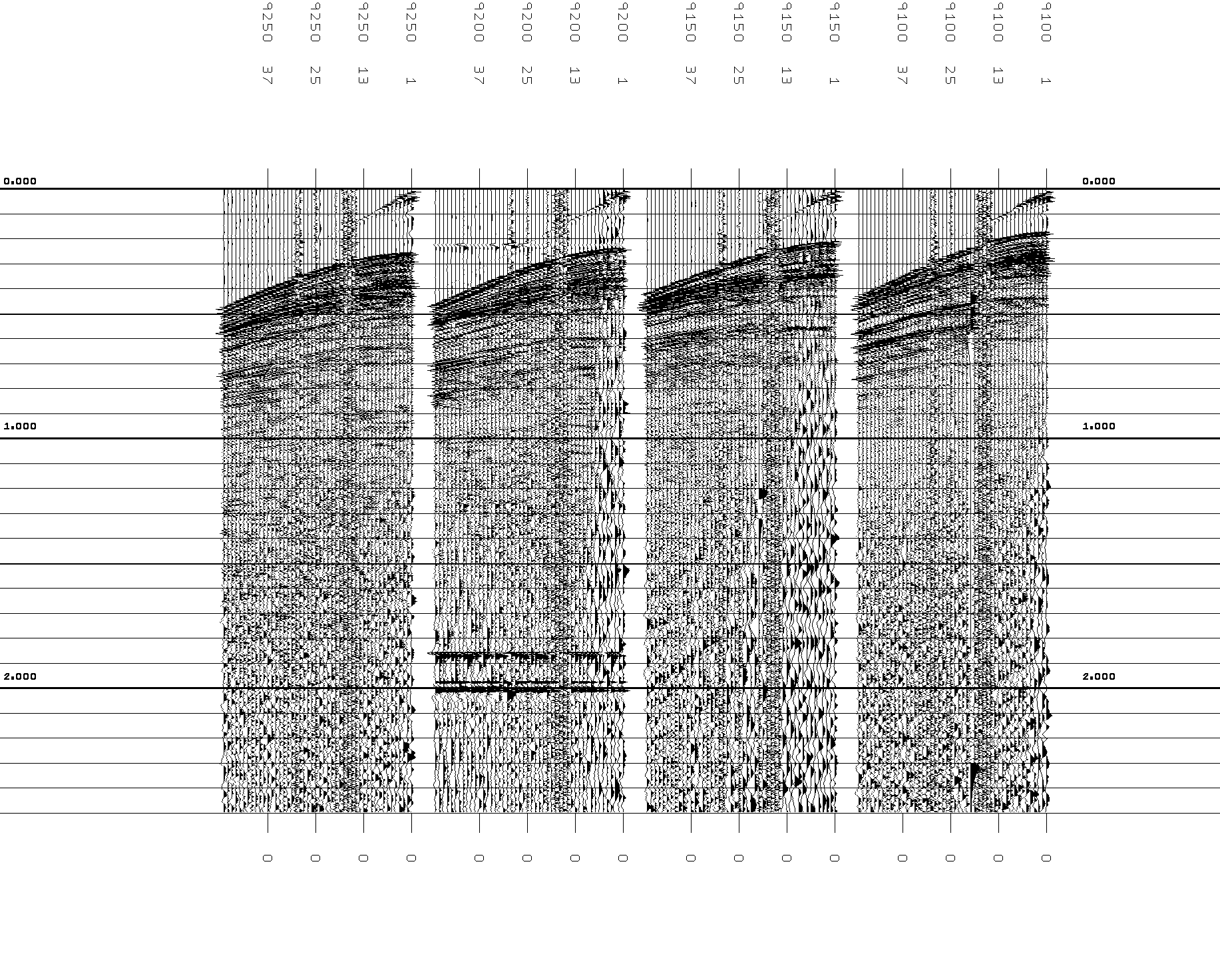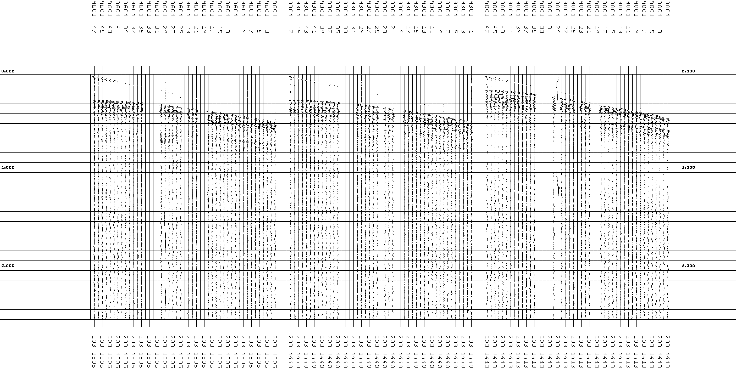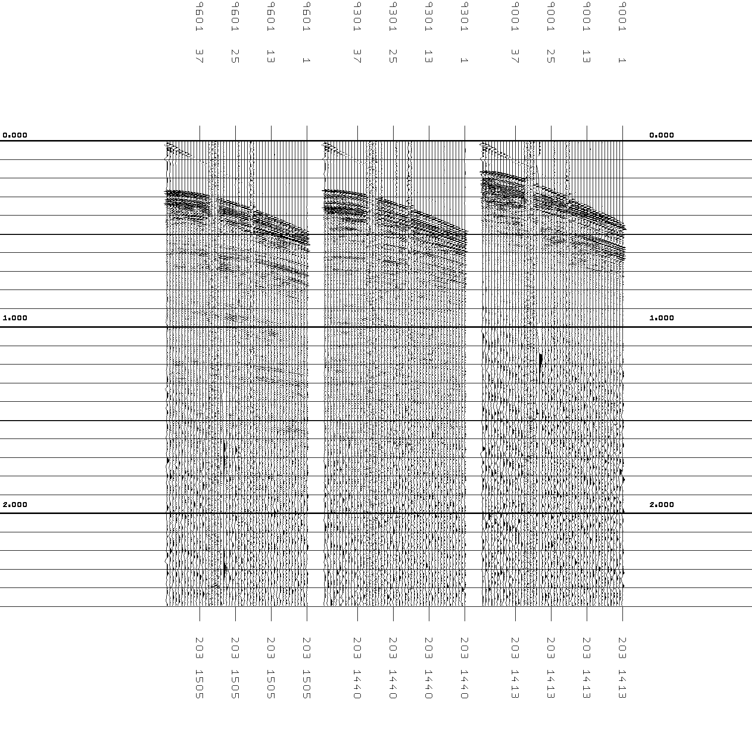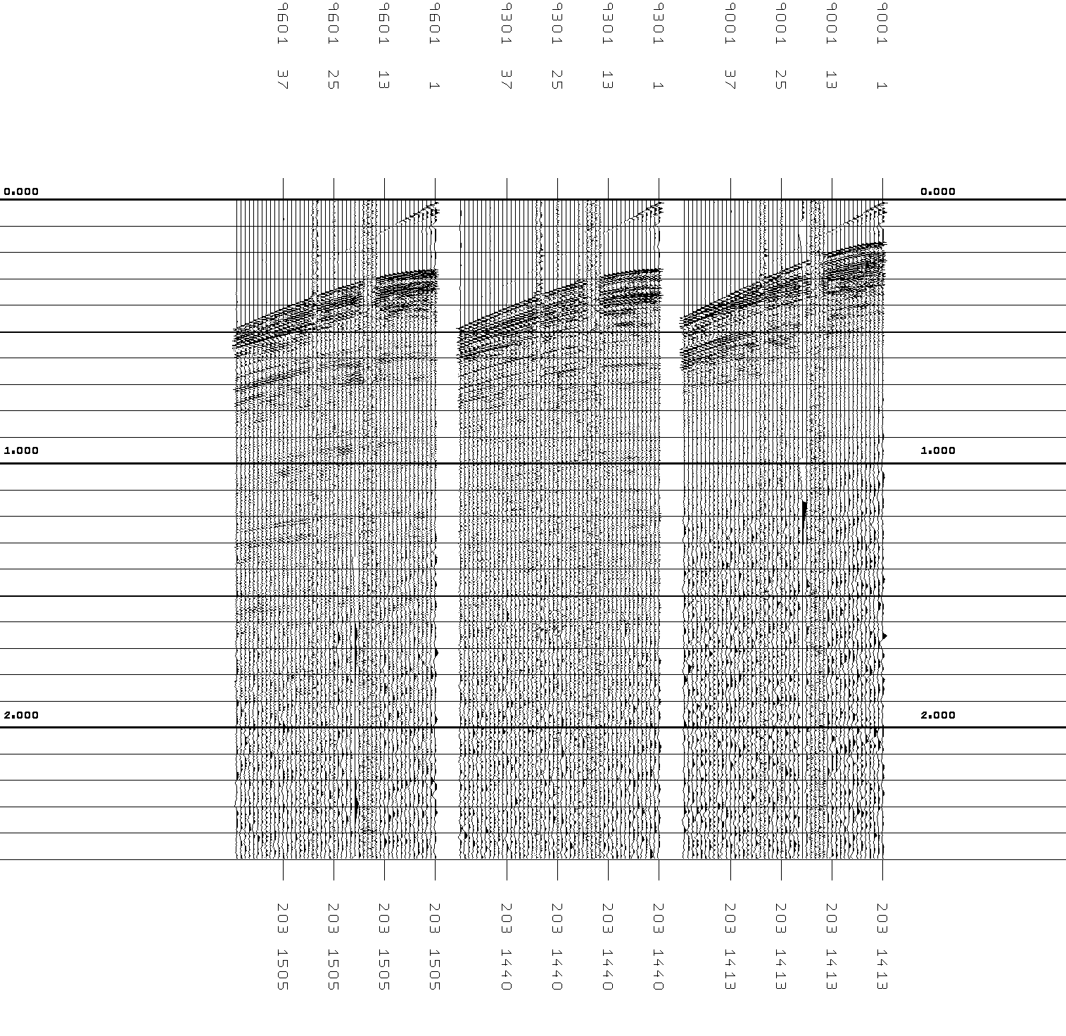 520>ls *segy* day203-1413z.segy day203-1440z.segy day203-1505z.segy day203-1413zRen.segy day203-1440zRen.segy day203-1505zRen.segy day203-1413zRev.segy day203-1440zRev.segy day203-1505zRev.segyPlot shows the first shot of each *z.segy file. Trace 1 is closest to the guns. The warning about the number of samples/trace in the segy binary header vs what is actually in each trace is a classic non-geophysist programmer. The first sample is time 0 and the last sample is at an even second. e.g. a 1s record has times 0-1.0, not 0-.999