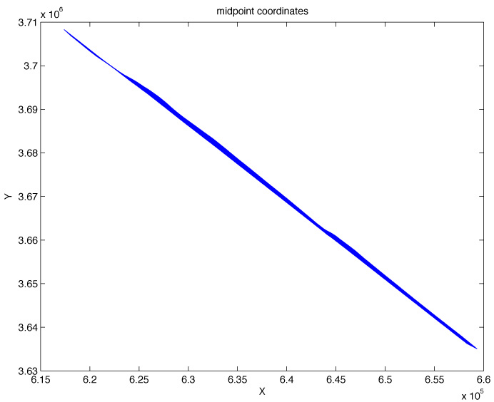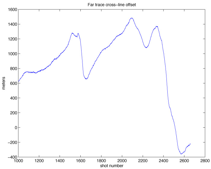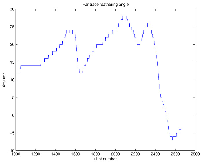 Generate a table with all the feathering angles, crossline offsets, and midpoint coordinates. Execute script as: syn 1001 2660 > l where script syn is: #!/bin/csh -f set FNO = $1 set LNO = $2 sioseis << eof procs syn geom header prout end syn fno $FNO lno $LNO ntrcs 240 secs 1 values 1 2 3 4 end end geom fs $FNO ls $LNO type 13 dbrps 6.25 rpadd 300 navfil ODKM03-B-00-003.p190 end end header fno 0 lno 999999 ftr 0 ltr 999 r58 = i48 / 10. r59 = l19 + l21 r59 = r59 / 2. r60 = l20 + l22 r60 = r60 / 2. end end prout fno 0 lno 999999 ftr 1 ltr 240 indices l3 l4 l6 l10 r58 i49 r59 r60 format (4(2x,F6.0),1x,F5.0,2x,F6.0,3(1x,f11.1)) end end end eof vi l and remove sioseis stuff plot(l(240:240:398400,1),l(240:240:398400,5) title('Far trace feathering angle') ylabel('degrees') xlabel('shot number') under matlab file, print as color ps level 2 with photoshop convert to jpeg plot(l(240:240:398400,1),l(240:240:398400,6) title('Far trace cross-line offset') ylabel('meters') xlabel('shot number') under matlab file, print as color ps level 2 with photoshop convert to jpeg plot(l(240:398400,7),l(240:398400,8) title('midpoint coordinates') ylabel('Y') xlabel('X') under matlab file, print as color ps level 2 with photoshop convert to jpeg