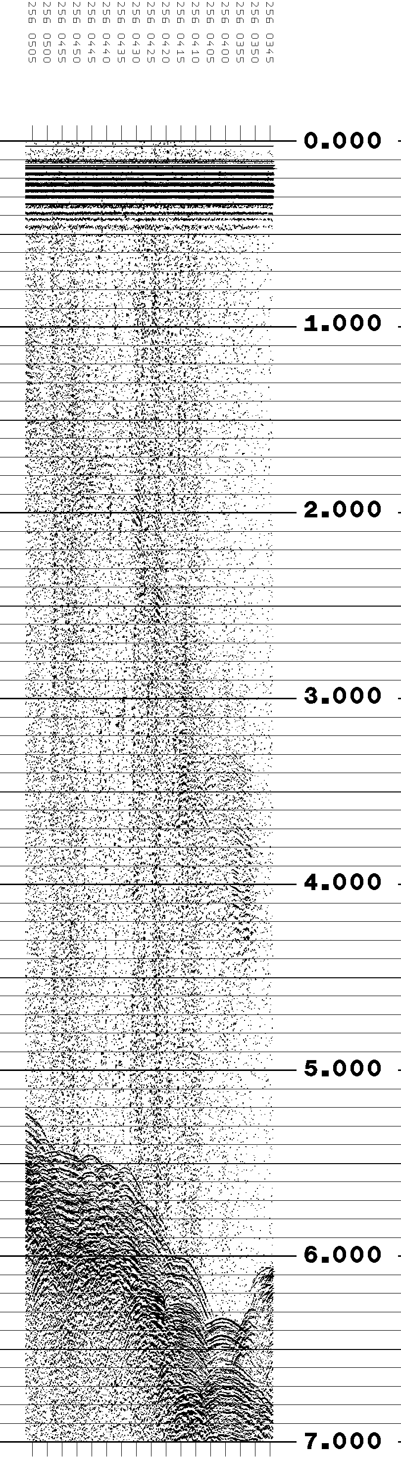Make sure the Sun executables are in a "nice" place. sioseis, lsd, sio2hp, and xloadimage are used in this example. You may have to set shell parameter DISPLAY. e.g. setenv DISPLAY your_machine:0.0 Don't forget xhost +. The Geometrics tape output is SEG-D, not SEG-Y. SEG-D is not for the faint of heart; dd'ing a SEG-D tape is not a good idea since every shot is a file. Convert the SEG-D tape to a SEG-Y disk file. The Geometrics records 24 channels, but the first use will have a four channel streamer. Only save traces 1-4 when converting to SEG-Y. e.g. sioseis << eof procs segdin diskoa prout end segdin ftr 1 ltr 4 device /dev/rmt/0bn end end diskoa opath file1.segy end end prout fno 0 lno 999999 noinc 100 ftr 1 ltr 1 end end end eof Following the AVON04 example: >lsd file1.segy 1 10 SHOT TR RP TR ID RANGE DELAY NSAMPS SI YR DAY HR MIN SEC 1 1 0 0 1 0 0 7000 1000 2003 253 16 31 34 1 2 0 0 1 0 0 7000 1000 2003 253 16 31 34 1 3 0 0 1 0 0 7000 1000 2003 253 16 31 34 1 4 0 0 1 0 0 7000 1000 2003 253 16 31 34 2 1 0 0 1 0 0 7000 1000 2003 253 16 31 44 2 2 0 0 1 0 0 7000 1000 2003 253 16 31 44 2 3 0 0 1 0 0 7000 1000 2003 253 16 31 44 2 4 0 0 1 0 0 7000 1000 2003 253 16 31 44 3 1 0 0 1 0 0 7000 1000 2003 253 16 31 54 3 2 0 0 1 0 0 7000 1000 2003 253 16 31 54 Do a QC check to make sure all 4 traces look good. e.g. sioseis << eof procs diskin plot end diskin ipath file1.segy ntodo 96 end end plot def .02 vscale 1.25 srpath sunfil.ras nsecs 7 nibs 2859 recsp yes ann sh&tr taginc 1 end end end eof xloadimage -r 90 sunfil.ras (test data plot.) All four traces look okay, so "vertically stack" them by using ntrgat 4 in diskin and adding stack in the procs. Remember that filter should be done after stack for speed. Finding the right plot "def" was hard because of the noise at the beginning of the data. Avon04 plot sioseis << eof procs diskin stack filter plot end diskin ntrgat 4 ipath file1.segy ntodo 2000 end end filter ftype 0 pass 20 150 dbdrop 48 end end agc winlen .5 end end plot vscale 1.25 srpath sunfil.ras nsecs 7 nibs 2859 ann gmtint anninc 5 trpin 200 def .02 wiggle 0 end end end eof xloadimage -r 90 sunfil.ras & A 3 trace mix does wonders for reducing the noise in the water column. Try it! (see the Avon example for other things to try). sioseis << eof procs diskin stack mix filter plot end diskin ntrgat 4 ipath file1.segy ntodo 2000 end end filter ftype 0 pass 20 150 dbdrop 48 end end mix weight 1 2 1 end end agc winlen .5 end end plot vscale 1.25 srpath sunfil.ras nsecs 7 nibs 2859 ann gmtint anninc 5 trpin 200 def .02 wiggle 0 end end end eof xloadimage -r 90 sunfil.ras & You may want to extract smaller portions of the data by using diskin parameters fgmt, lgmt, fday, lday e.g. diskin ntrgat 4 fday 253 lday 253 fgmt 1645 lgmt 1715 ipath file1.segy end end There are several programs that convert Sun rasterfiles to PostScript, though I don't like any on the Sun (suntops and ras2ps), so I use GraphicConverter on the Mac. ImageMagik might work. Some people are using sioseis' process grdout and GMT. You may want to create wallpaper on the HP plotter. You must generate a SIOSEIS plot file (plot parameter opath) and then convert it into an HP rasterfile using program sio2hp. Then lpr it. Have fun guys!Return to SIOSEIS examples. Go to the list of seismic processes. Go to SIOSEIS introduction.
