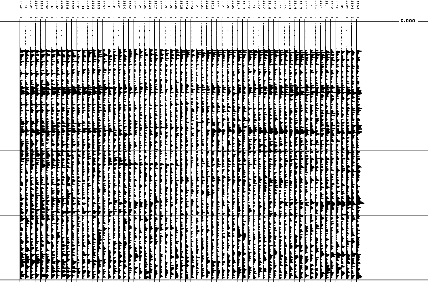 A 2001 example plot. The processing was done in three steps: 1) Read the data tapes onto disk. 2) Convert the Edgetech format to SEGY and filter (script). 3) Pick the water bottom, mute, apply gain, and plot (script).plot of all traces of the first 30 shots was generated by this script.EdgeTech's SEG-Y is slightly different from SIOSEIS's, but SIOSEIS process HEADER and GAINS can rectify the differences. An analysis of the differences is included here.