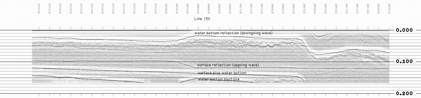 This example shows applying a datum correction to some Edgetech towed fish chirp data where the fish depth nor the wireout distance are known. The datum correction is calculated by identifying and picking different events or wave paths on the data. The first method involves identifying and picking the surface reflection (the upward pulse from the fish, reflected off the water surface, then back down to the fish). This is simply the fish depth in two way travel time. See figure 1 and figure 2. The second method requires picking the event caused by the water bottom reflection of the upgoing surface reflection and picking the water bottom reflection of the downgoing pulse. The first step in Edgetech data processing is to convert the data into SEG-Y. sioseis << eof procs diskin xstar diskoa end diskin format edgetech ipath line164.sgy end end xstar type 2 end end diskoa opath line164.segy end end end eof ***** Note ***** There's a new XSTAR parameter, TYPE, that's needed to differentiate between 1 trace and two trace XSTAR system. METHOD 1 Pick the surface reflection ------ - METHOD 2: Pick the water bottom reflection of the surface reflection ------ - A quick QC plot (created with this script) shows unrealistic geology caused by the variation in the depth of the towed fish. In an earlier Edgetech project I was able to correct the data to a datum by an automated pick of the water bottom multiple. In a different project I was able to do the datum correction using the water depth from Seabeam center depth. Unfortunately, neither of those methods worked on this dataset. The recorded data length of this dataset is not long enough to include the water bottom multiple. The corrections using the Seabeam (from an xyz file), didn't work well either because the wireout distance was changed frequently and was not recorded, thus the fish depth is not known. While looking at the above plot, I noticed a nice, geologically realistic, event at the bottom. If we assume that this event is the water bottom, relative to the sea surface, and shift the water bottom of the data to be at this time, then the plot might be correct! Unfortunately, I could not find an automatic picking algorithm that would pick the even. An automated pick would also introduce the "heave" (wobble) I noticed on the event. Picking the event "by hand" was too tedious. The script was used to produce a SIOSEIS rasterfile (plot)and header file suitable for the picking program SIOPLT. SIOPLT was executed as: sioplt -if siofil -wbt wbt -hf hdrfil and file siopltrc had: width 1400 height 800 The picks were loaded into another script which automatically picks the water bottom time after doing a 3 trace mix, computes the time shift between the water bottom time and the event picked as where the water bottom is supposed to be, then applies the shift. The data are save to disk (in IBM floating point so SU can read it) and then filtered and plotted for quality control. Notice that the water bottom has several peaks and troughs. This is caused by the filter being too narrow and or too steep slope. With experimentation I found dbdrop 12 made the water bottom into a single cycle. The end user also wanted to data compressed more, so I decimated the data by throwing out 2 of every 3 traces (this was also the reason why I did a three trace mix earlier; average 3 traces and then keep only 1 of the 3). It was also decided to get as much dynamic range as possible without apply any gains, so the plot is with gray scale. The script created the final plot.Back to SIOSEIS examples. Go to SIOSEIS introduction. Go to the list of seismic processes.
