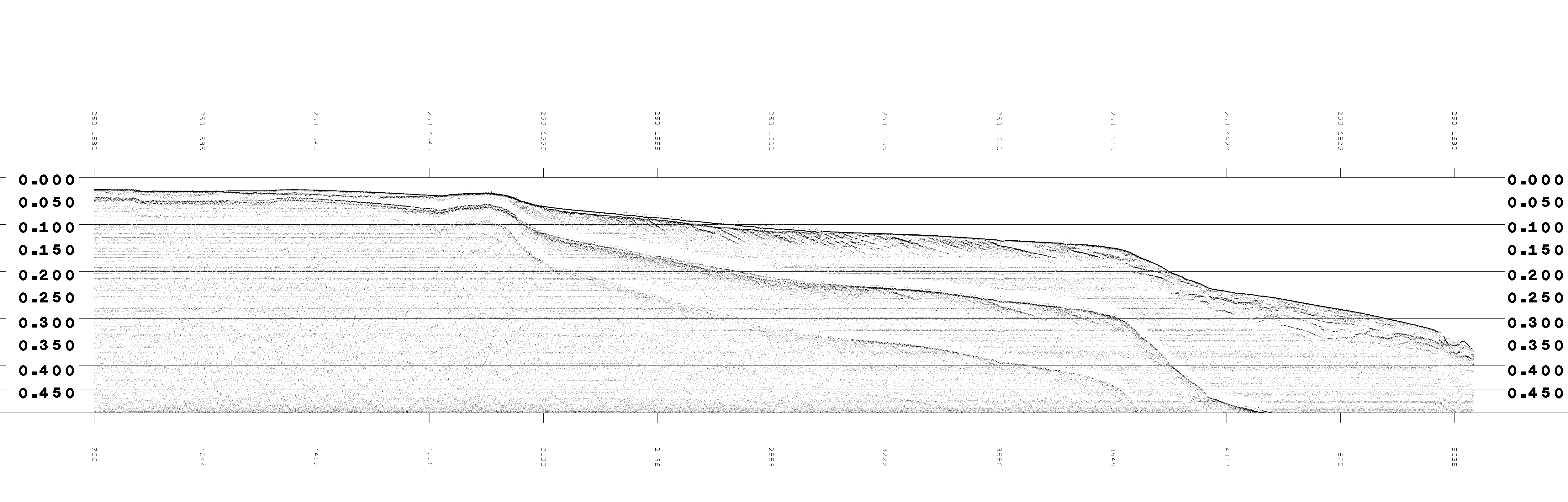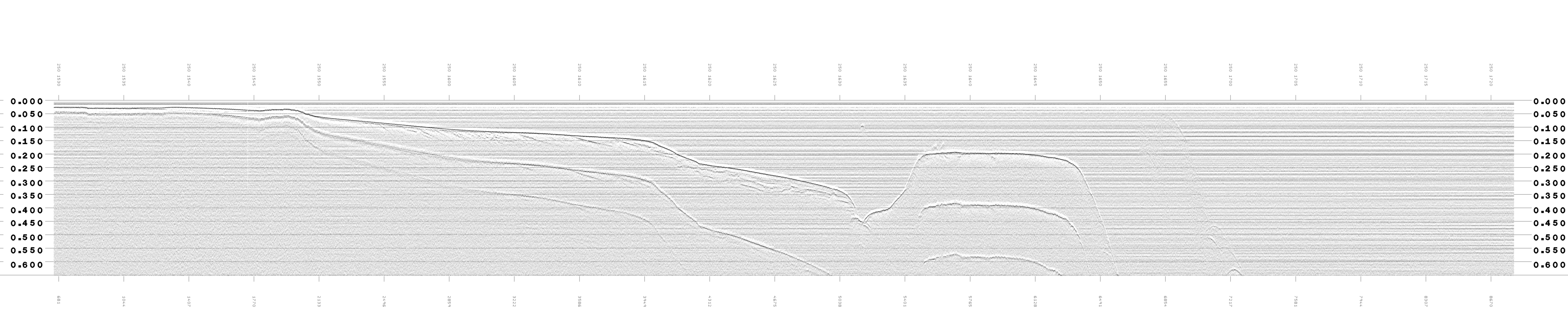 Trackline Comparison plots of PostSurvey processing and Sioseis processing and the description. This large (9MB) plot is after some parameter "tweaking" and shows the high spatial resolution of multi-ping SBP (sub-bottom profiler or chirp profiler). There are 2-3 pings per second (~160 in 5 minutes). The annotation along the top of the plot is time (day-of-year and gmt time). The vertical is two-way travel time. The plot is early in analyzing the post-processing of .sgy recording. It may help to enlarge the plot (Firefox=left click). Note some thin ponds (1538z to 1545z and 1550z to 1602z). Note the water column at 1655z.Initial post-processing steps