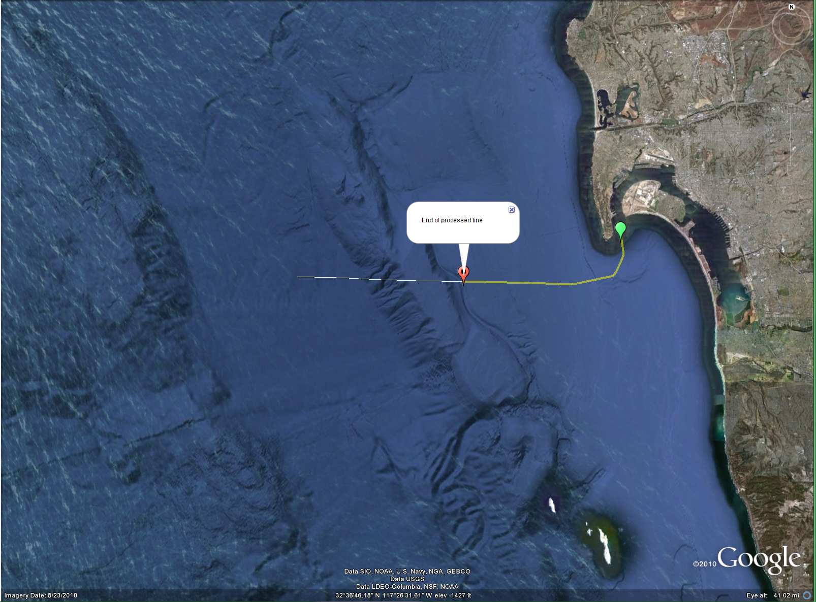Step 1 was the usual mkenv script which makes an envelope file from a correlate file. (See mkKnudsen.html and other examples for the fundamentals of SBP processing). Step 2 was slightly different from the "usual" mkplt.html script which makes a png plot file from an envelope file. The "usual" "hangs" an exponential gain from the seafloor and performs a bandpass filter. Unfortunately, Knudsen's automatic water depth picker picked the strong, constant, event at .01 seconds on every ping. Thus, the plot was created using a .02s AGC window. The plot parameters used are slightly different too. The plot was quite low (too gray, the water bottom was not black). PLOT parameters: colors .001 gray1 .002 gray2 .003 gray3 .004 gray4 .005 gray5 .006 gray6 .007 gray7 and def .005 were used. The horizontal stripping is noise that was brought up to the same level as the signal (water bottom). The plot at this stage is excellent for QC (quality control) purposes and determining if and what should be processed further. In this case, it was decided to compare the Knudsen PostSurvey processing of .keb files and Sioseis processing of .sgy files. PostSurvey is the only known program to read .keb files. Step 3 was to eliminate the very strong instrument noise in the first .025s by muting ( ttp 1 .025 ). It took a bit of analysis to realize that the early event was so strong. All the automatic pickers in WBT (PEAK POS and THRES) all picked it. It was only after dumping the amplitudes on several pings (PROUT SETS 0 .5) did it become apparent that ALL horizontal events are instrument noise and the early ones were larger than the water bottom reflection. Step 4 is a combination of trial and error processing tries, resulting in produced by this script.