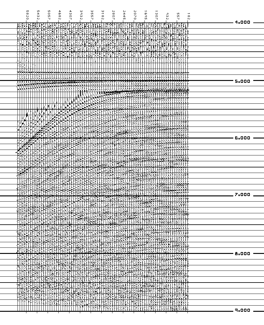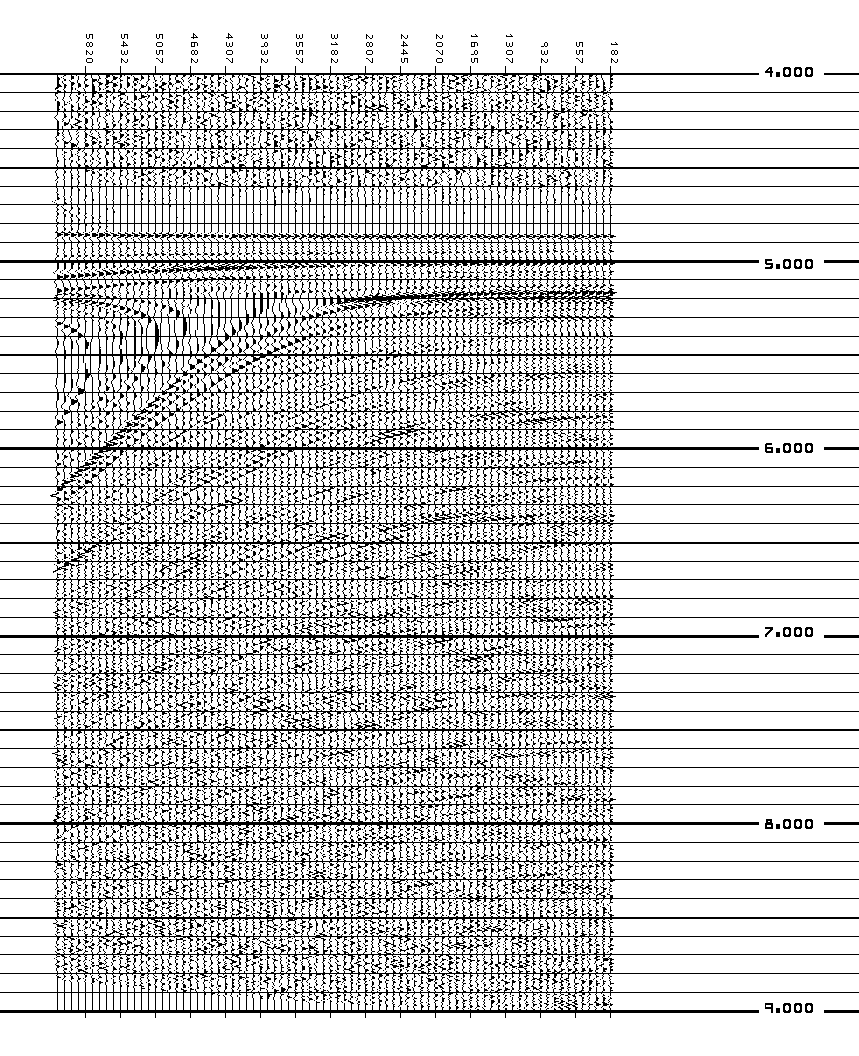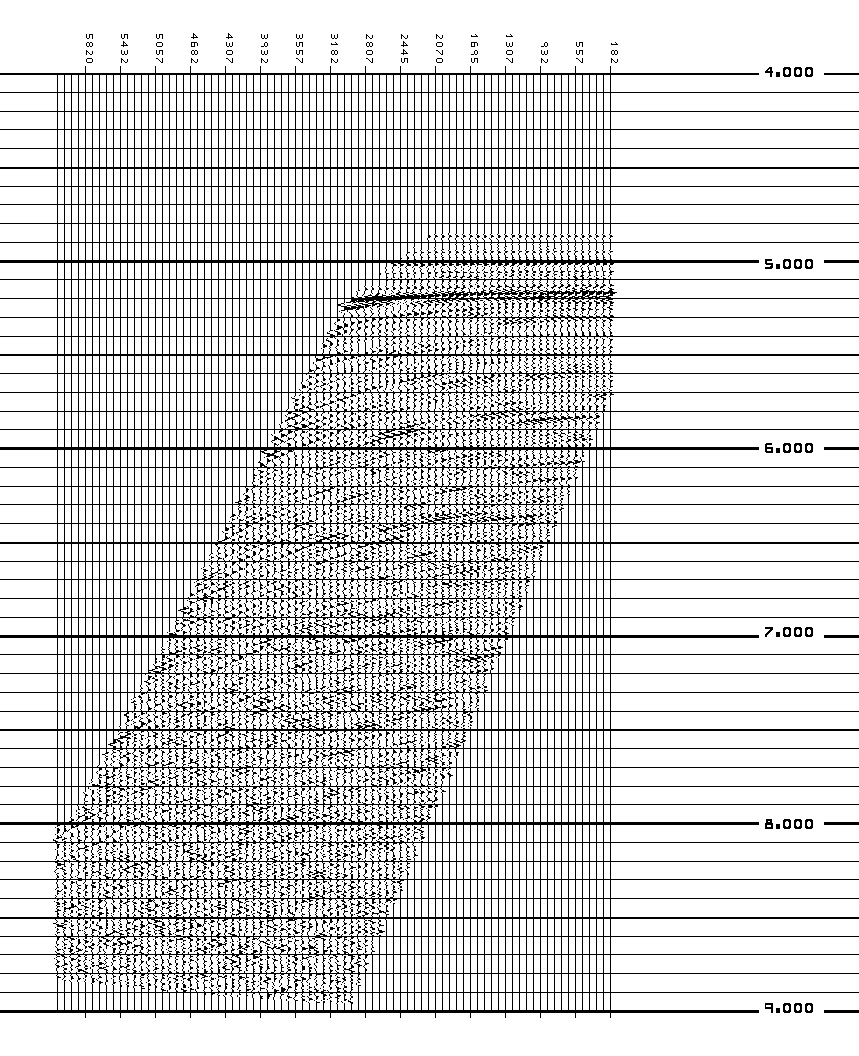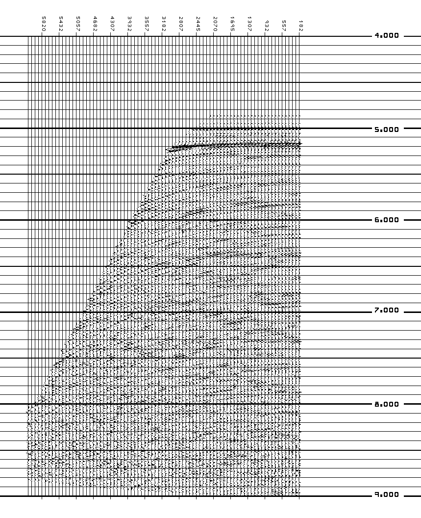 Notice that the ranges are from 182m to over 6000m. NMO created some weird affects on the long range traces with velocities: vtp 1495 4.85 1515 5.0 1555 5.167 2100 5.567 3500 6.567 end The NMO time actually decreased and the increased, causing some data to be mirrored.plot of mirrored data