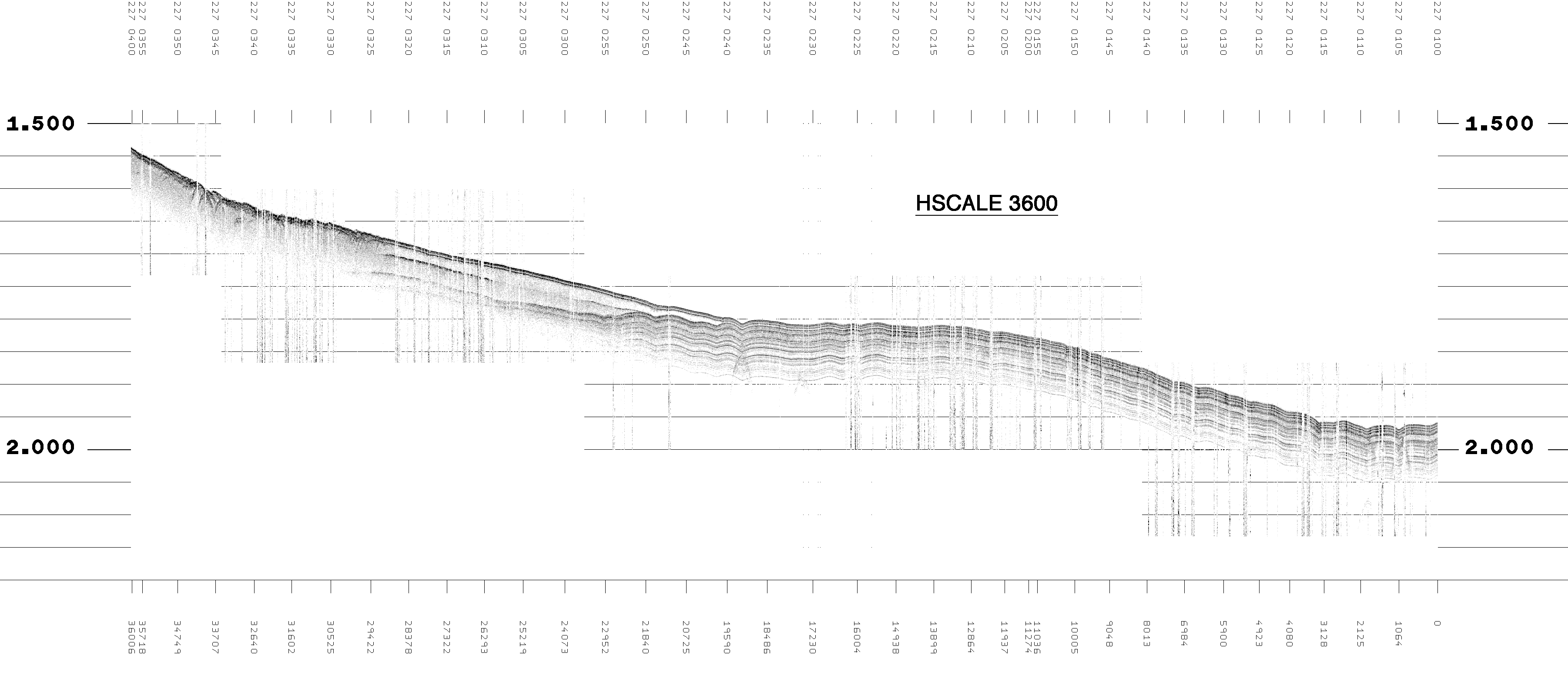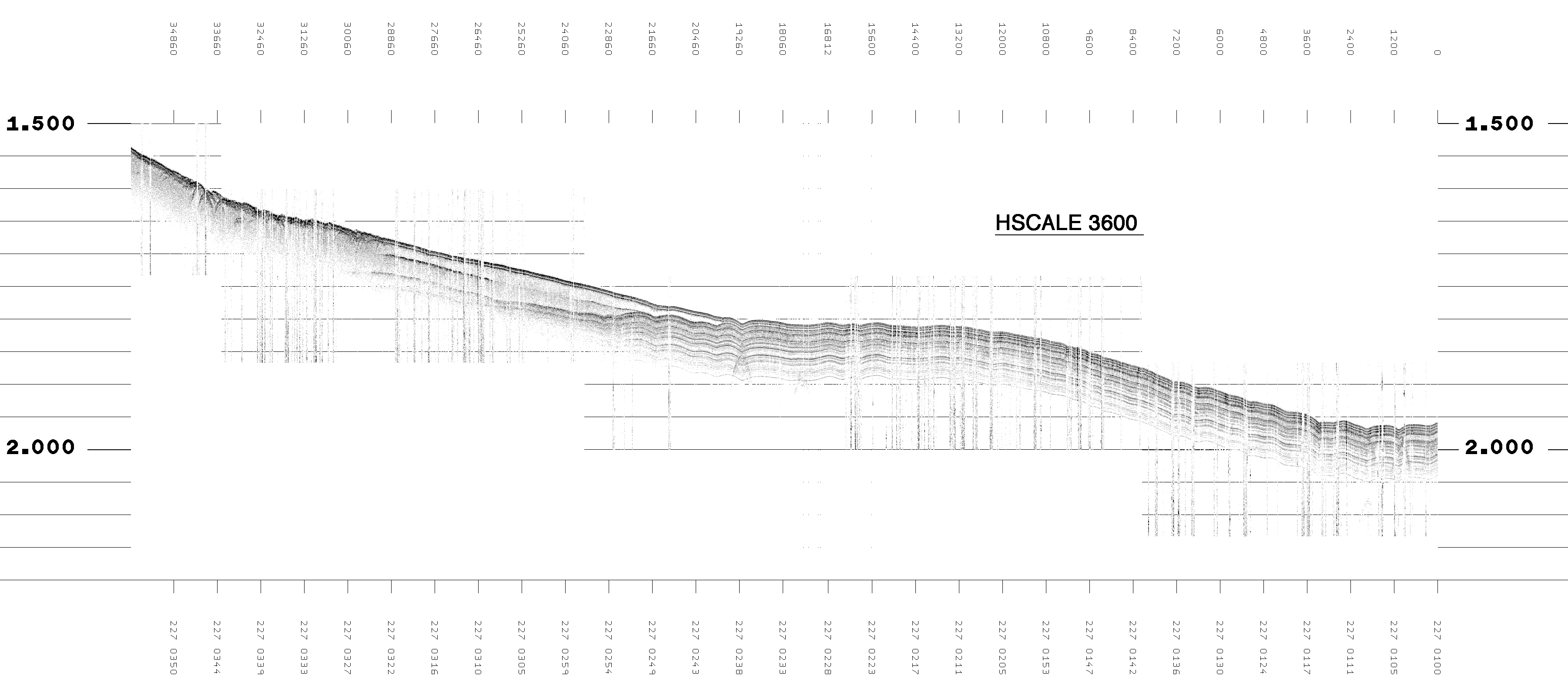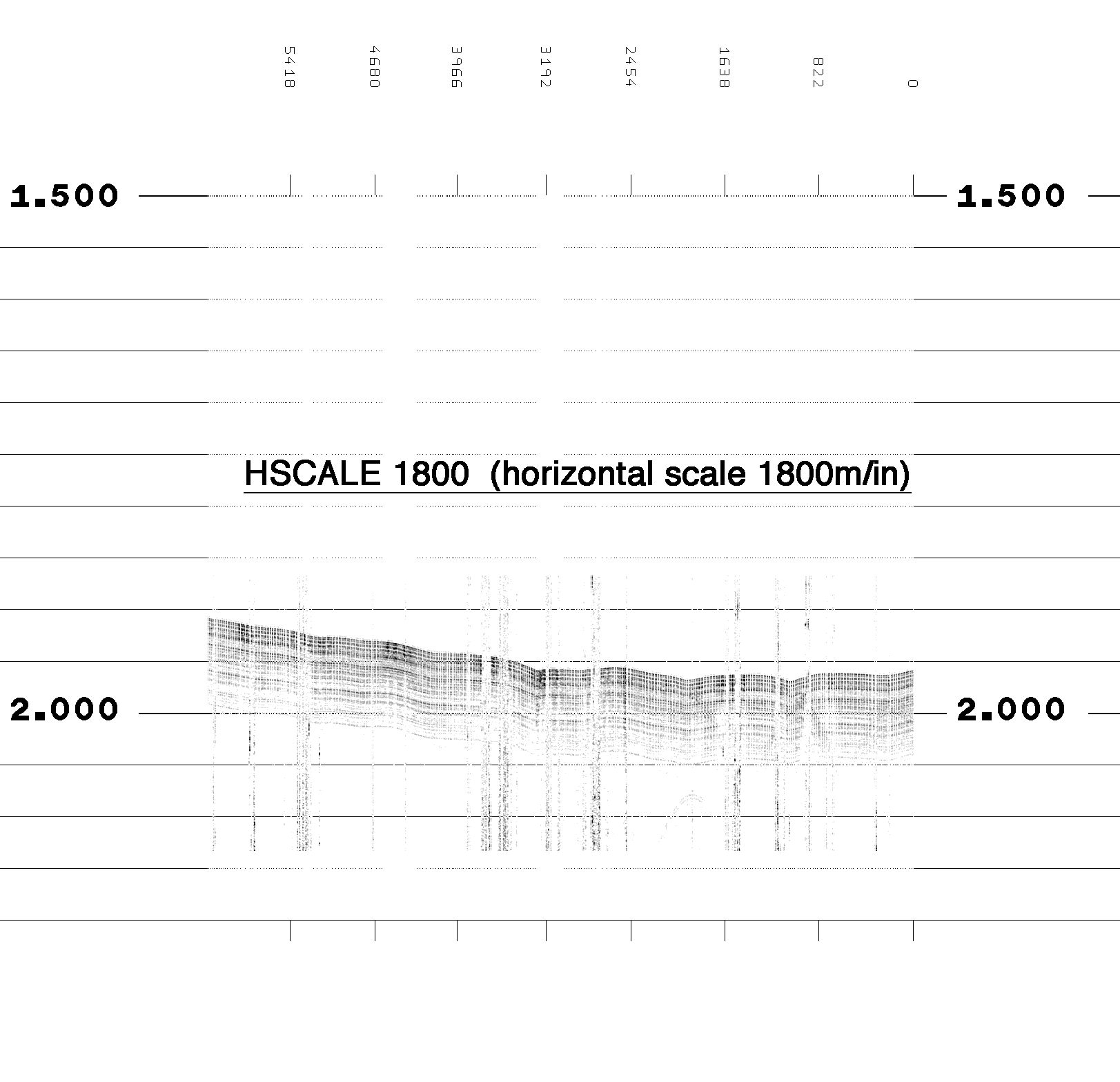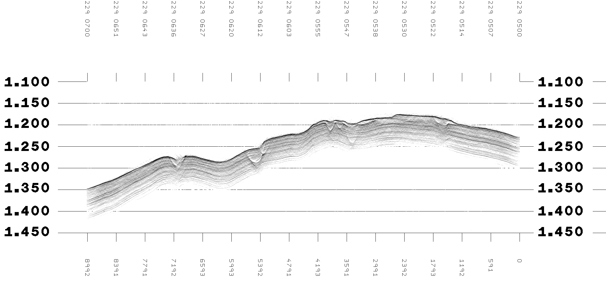 Example 1 covers day 229, 0500z to 0700z. Based on previous work (see SBP plotting and migration) step 1 is to create a smaller file of just the two hours of data we're interested in. The script assumes the data are already in envelope form and combines several steps of the previous work. The data are filtered and decimated in the output file and a plot is generated as well. The prout info 1 parameter displayed: env-2006_229_0500z-0700z. Begins: day229 05:00:01, lat: 77 41 13.544 long: 176 35 36.182 env-2006_229_0500z-0700z. Ends: day229 07:00:59, lat: 77 45 42.490 long: 176 32 37.709 data times: 1.066 to 1.467 secs. Using program distance, this data segment is 8423.65818 meters. lsd shows the file has 4734 shots, thus the average distance between pings is 1.8 m The jumps in the above plot are caused by changes in the SEGY deep water delay, which are produced on the Knudsen when the SBP "phase" is changed. DISKIN parameter SET 1.1 1.45 will eliminate these changes and make a constant data window for FK processing. Using fkmigr deltax 1.8 and plotting every trace, produced an over migrated plot. fkmigr delta 1.8 with plot hscale 900 yielded this plot. fkmigr delta 1.8 with plot hscale 1800 yielded this plot. Using a 3m bin/stack, fkmigr deltax 3, and plot hscale 1800 results in a great plot. I don't understand the light shaded "cone" areas. (Is it due to the point sources being "out of plane" or off to the side of the ship's track rather than directly under the ship.?) Example 1