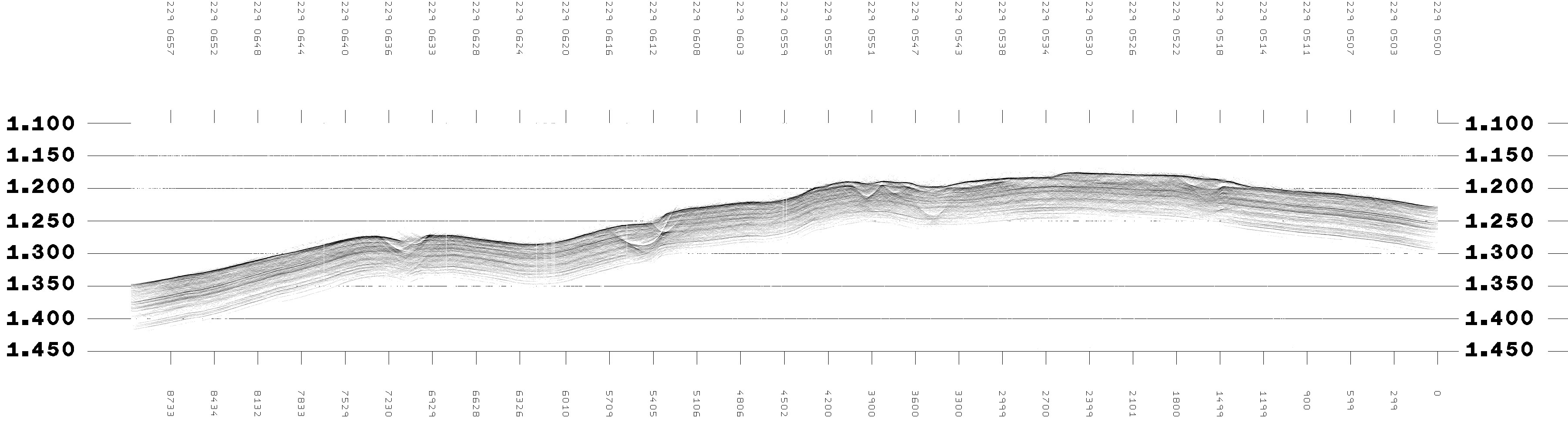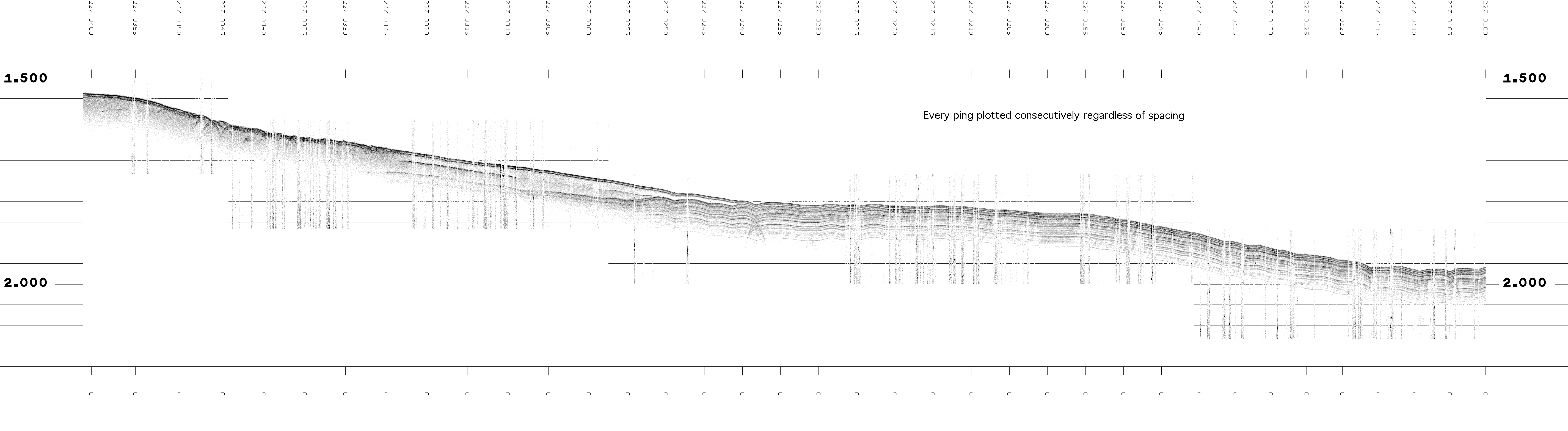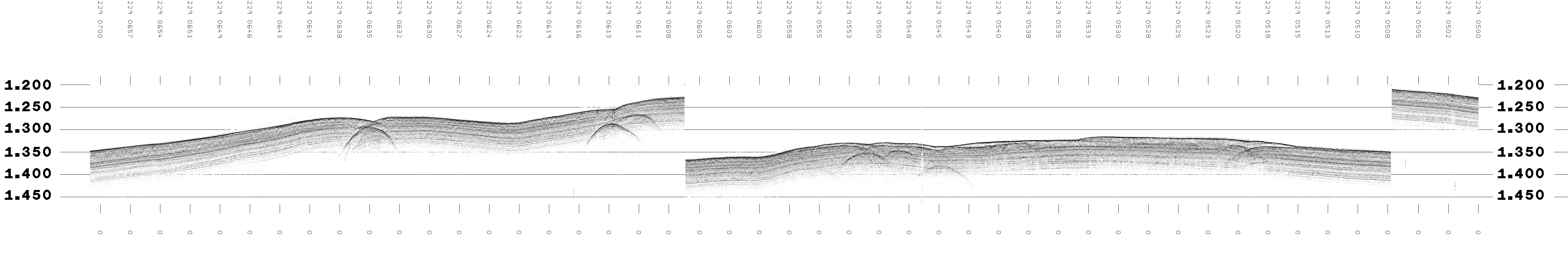 Example 1 covers day 229, 0500z to 0700z. Based on previous work (see SBP plotting and migration) step 1 is to create a smaller file of just the two hours of data we're interested in. The script assumes the data are already in envelope form and combines several steps of the previous work. The data are filtered and decimated in the output file and a plot is generated as well. The prout info 1 parameter displayed: env-2006_229_0500z-0700z. Begins: day229 05:00:01, lat: 77 41 13.544 long: 176 35 36.182 env-2006_229_0500z-0700z. Ends: day229 07:00:59, lat: 77 45 42.490 long: 176 32 37.709 data times: 1.066 to 1.467 secs. Using program distance, this data segment is 8423.65818 meters. lsd shows the file has 4734 shots, thus the average distance between pings is 1.8 m The jumps in the above plot are caused by changes in the SEGY deep water delay, which are produced on the Knudsen when the SBP "phase" is changed. DISKIN parameter SET 1.1 1.45 will eliminate these changes and make a constant data window for FK processing. Using fkmigr deltax 1.8 and plotting every trace, produced an over migrated plot. fkmigr delta 1.8 with plot hscale 900 yielded this plot. fkmigr delta 1.8 with plot hscale 1800 yielded this plot. Using a 3m bin/stack, fkmigr deltax 3, and plot hscale 1800 results in a great plot. I don't understand the light shaded "cone" areas. (Is it due to the point sources being "out of plane" or off to the side of the ship's track rather than directly under the ship.?) Example 1
