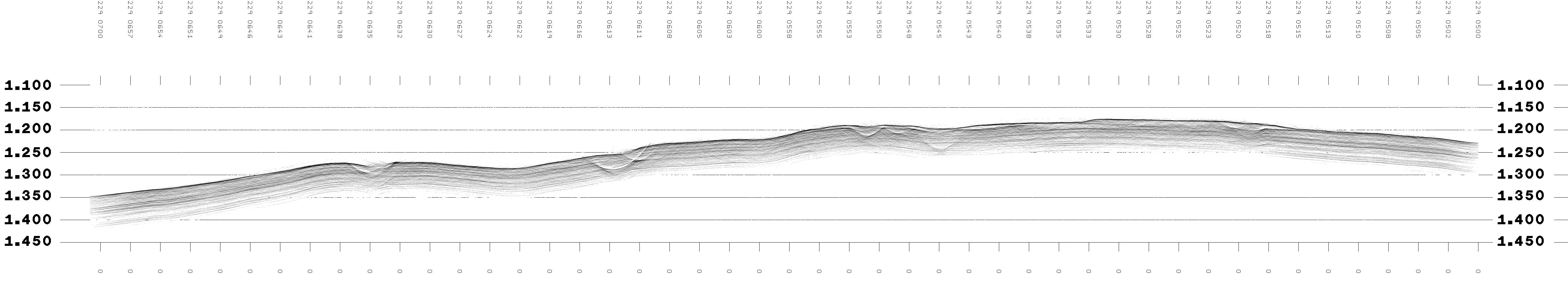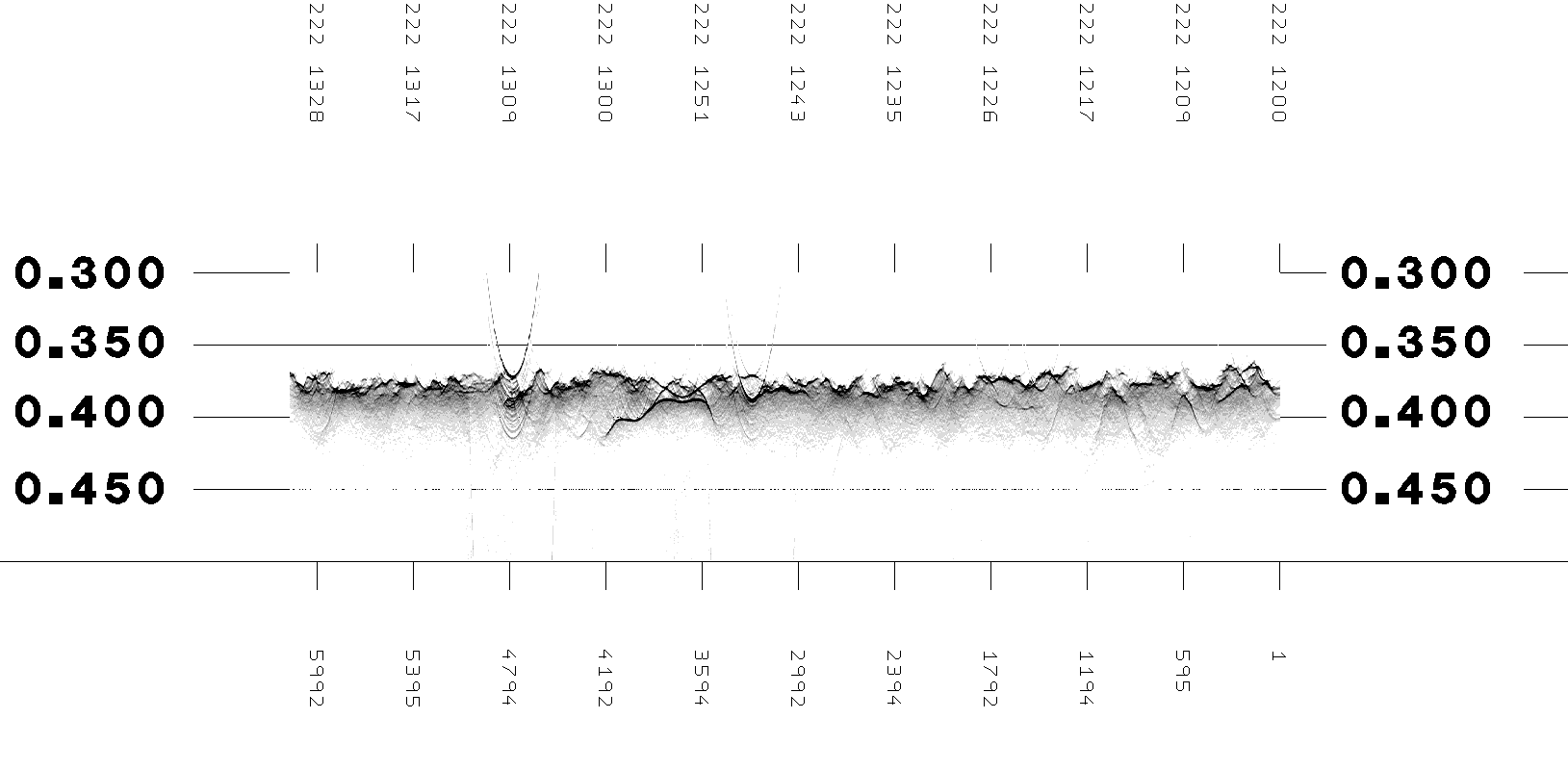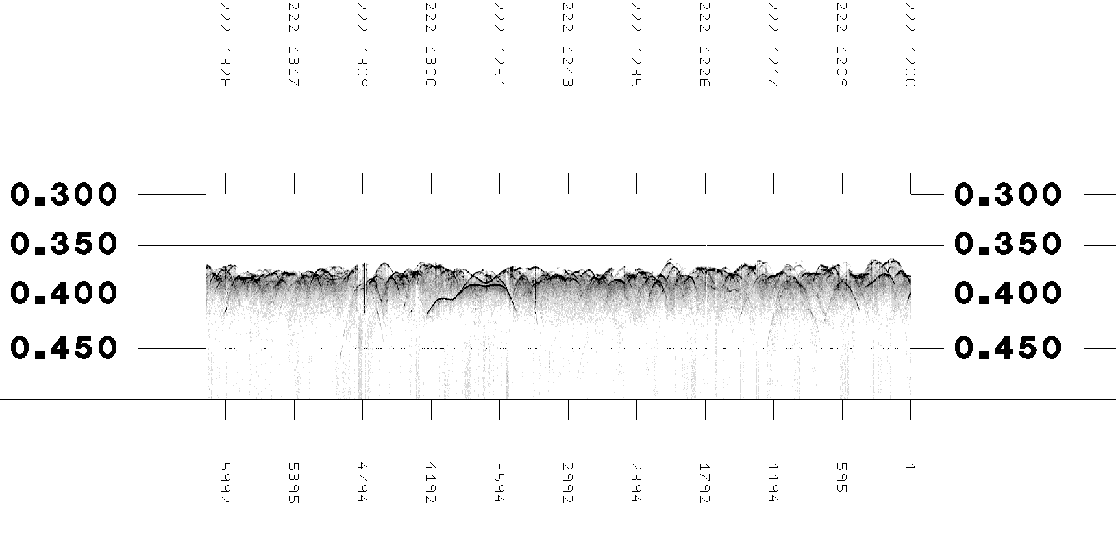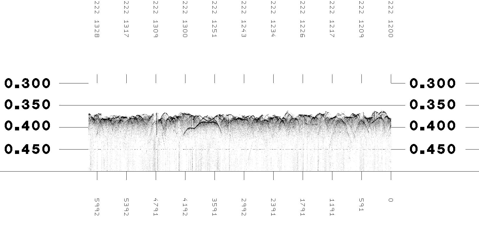 Example 1 covers day 229, 0500z to 0700z. Based on previous work (see SBP plotting and migration) step 1 is to create a smaller file of just the two hours of data we're interested in. The script assumes the data are already in envelope form and combines several steps of the previous work. The data are filtered and decimated in the output file and a plot is generated as well. The prout info 1 parameter displayed: env-2006_229_0500z-0700z. Begins: day229 05:00:01, lat: 77 41 13.544 long: 176 35 36.182 env-2006_229_0500z-0700z. Ends: day229 07:00:59, lat: 77 45 42.490 long: 176 32 37.709 data times: 1.066 to 1.467 secs. Using program distance, this data segment is 8423.65818 meters. lsd shows the file has 4734 shots, thus the average distance between pings is 1.8 m The jumps in the above plot are caused by changes in the SEGY deep water delay, which are produced on the Knudsen when the SBP "phase" is changed. DISKIN parameter SET 1.1 1.45 will eliminate these changes and make a constant data window for FK processing. Using fkmigr deltax 1.8 and plotting every trace, produced an over migrated plot. fkmigr delta 1.8 with plot hscale 900 yielded this plot. fkmigr delta 1.8 with plot hscale 1800 yielded this plot. Using a 3m bin/stack, fkmigr deltax 3, and plot hscale 1800 results in a great plot. I don't understand the light shaded "cone" areas. (Is it due to the point sources being "out of plane" or off to the side of the ship's track rather than directly under the ship.?) Example 1